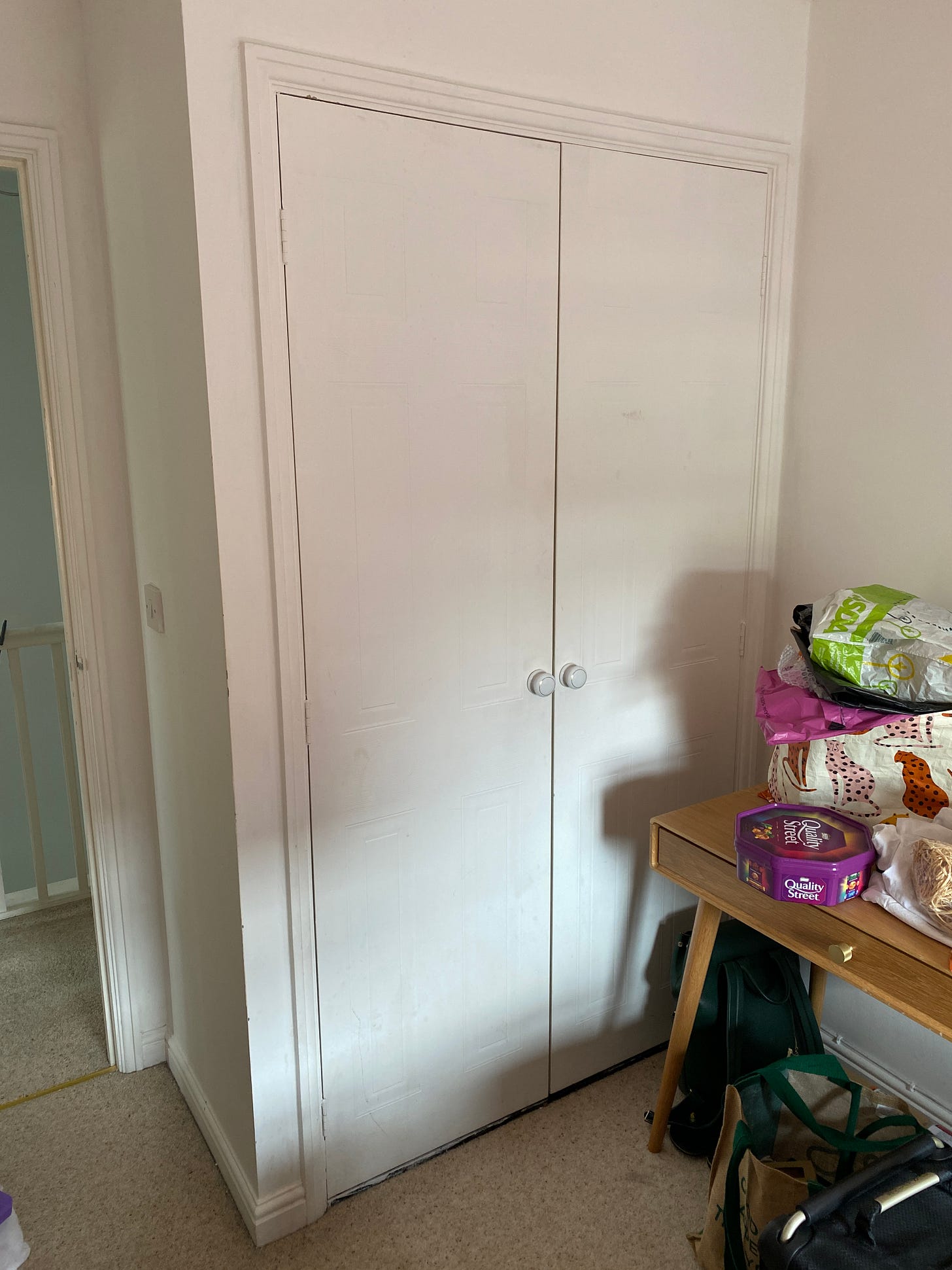 But here’s the thing, or rather, things. The cupboard in question measures 130x60cm, has four shelves (which granted can easily be removed or rearranged), the doors are around the size of a standard room door (if you know what I mean) and open outwards, and there’s a piece of wood along to floor which I’m already thinking would be an annoying obstacle for a chair.