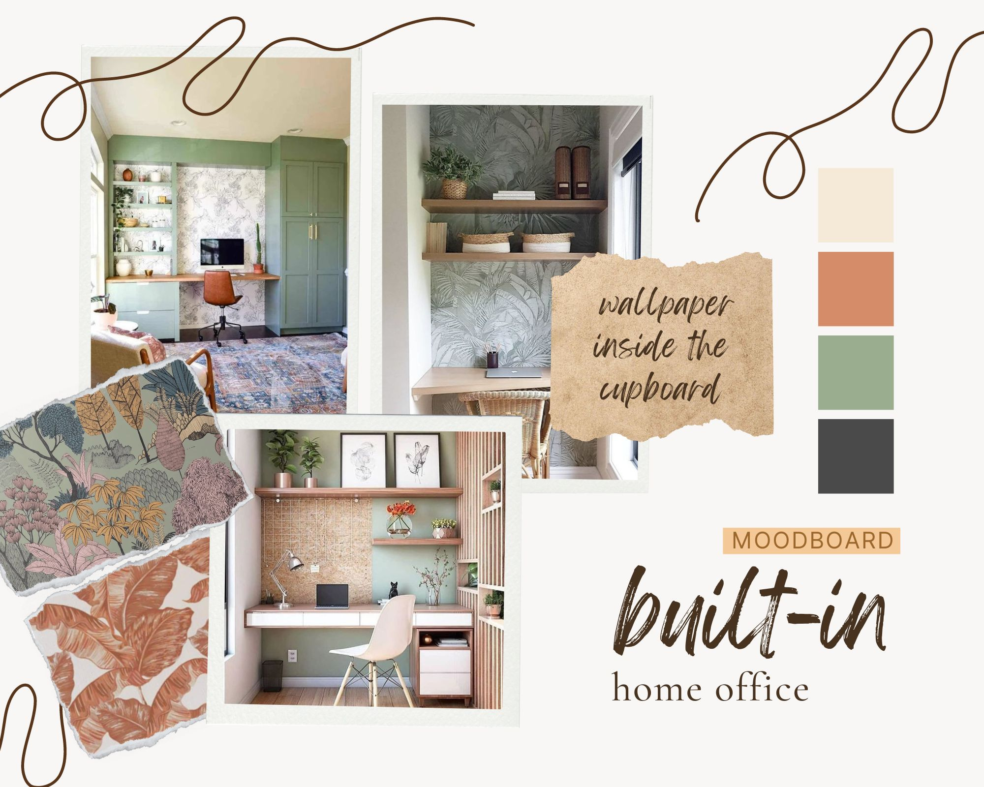I like the idea of a corkboard backdrop to the desk so I can pin ideas, notes and deadline reminders, and I also feel like a colourful wallpaper with a cheery print wouldn’t go amiss. There’s something nice about a surprise of bold pattern or colour behind the doors of a built-in design, especially as the rest of the room is to be painted in a warm off white called Tahitian Vanilla.
