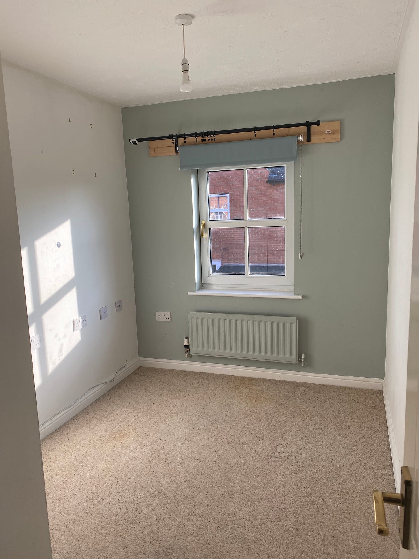 The spare room is the smallest bedroom in the house – about three by two metres. It has a rather chunky built-in wardrobe along one wall which was already there when we moved in (prime dumping ground spot), which does impede the layout options somewhat, especially when since there’s a double bed in there for when friends and family visit, too. Decor-wise, it’s in need of a lick of paint – one wall is currently a duck egg shade and the others white, but with the remnants of child stickers dotted around from whoever inhabited it before. The radiator is painted in the same duck egg (don’t ask) and there’s an inoffensive beige carpet.
